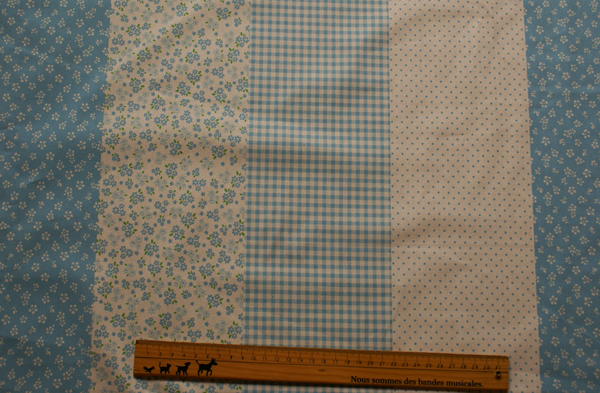 お花にドット、チェックがボーダーにプリントされた 一枚で4種類の柄が楽しめるキュートな生地です。 カーテンやクッション等のインテリア、バッグ等の 布小物等、いろいろ活躍してくれますよ♪