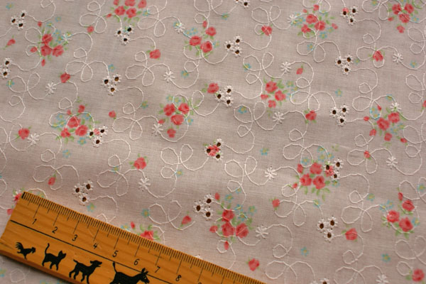 お花がプリントされたキュートな綿レースです。 キャミソールやワンピース、ボレロにしてもかわいいですね。 布小物にもいいですよ♪